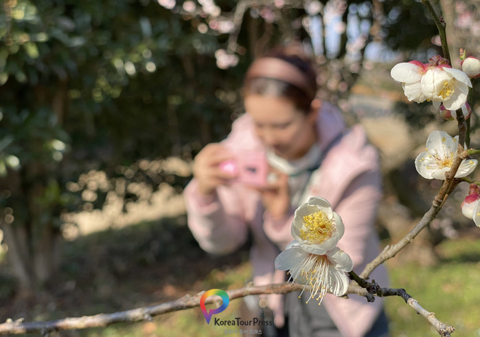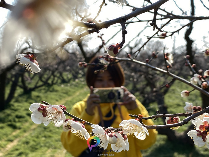 | ▲ 20일 전남 해남군 산이면 보해매실농원을 찾은 상춘객이 남들보다 한발 앞서 피어난 매화를 밝은 표정으로 사진에 담고 있다. |