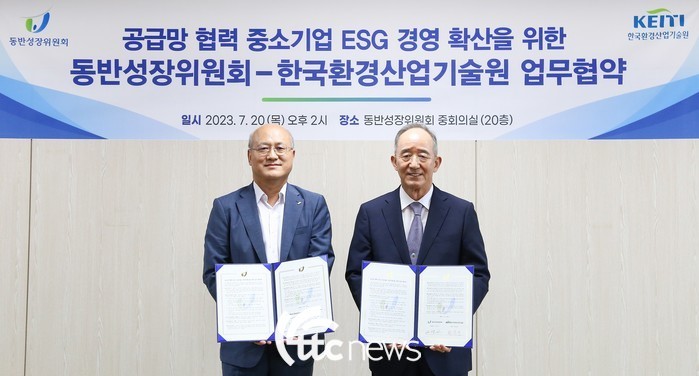 한국환경산업기술원(원장 최흥진)은 20일 동반성장위원회(위원장 오영교)와 ‘공급망 협력 중소기업의 환경-사회-투명경영(ESG) 경쟁력 강화’를 위한 업무협약을 체결했다.