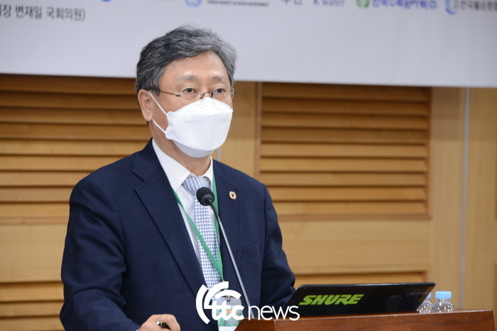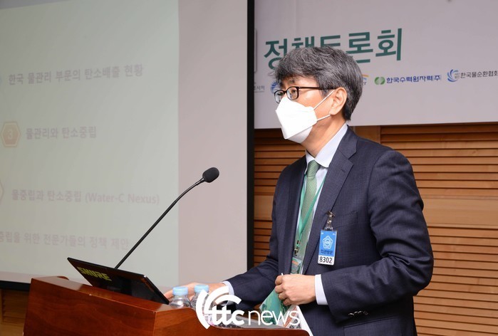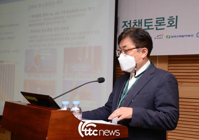 ‘탄소중립시대의 물관리 정책’을 제목으로 발제한 김동구 환경부 물통합정책관은 “기후변화의 심각성 인식이 확대되고, ‘장기 저탄소 발전전략’의 제출 시한이 도래함에 따라 주요국의 탄소중립선언이 가속화 되고 있다”고 소개하고, “정수장 등 물관리 기초시설 에너지 효율화와 물수요 저감을 통한 에너지 사용을 절감하고, 수상태양광, 수열에너지 등 재생에너지 생산, 수변구역과 댐 홍수터 등 녹지를 통해 탄소흡수원 조성해 2050까지 물관리 분야의 탄소중립 실현한다”는 계획을 밝혔다.