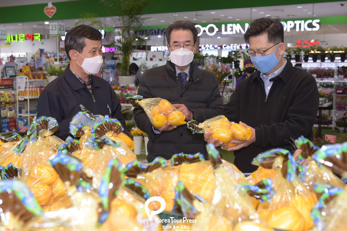 | ▲ 19일 서초구 농협 하나로마트 양재점에서 농식품부 김현수 장관과 농협중앙회 이성희 회장 및 농협유통 정연태 대표이사가 ‘친환경 농산물 특별판매전’ 현장점검하고 있다.(사진=농협유통 제공) |