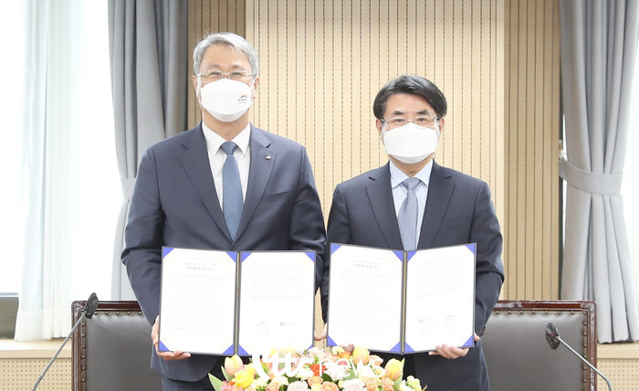 | ▲ 11일, 대전시 대덕구 한국수자원공사 본사에서 국내 물산업 발전 및 인재육성을 위한 산학협력 업무협약을 체결한 후 박재현 한국수자원공사 사장(사진 왼쪽)과 국립한경대학교 이원희 총장이 기념촬영하고 있다.(사진=한국수자원공사 제공) |
