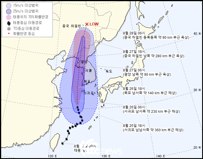 | ▲ 제8호 태풍 '바비'가 제주도 서귀포 남남서쪽 약 360㎞ 해상까지 올라왔다. 기상청은 태풍 바비가 내일 오후 제주도 서쪽 해상을 지나 북상하다, 모레 새벽 북한 황해도 부근 연안에 상륙할 것으로 예측했다. 바비는 중심기압 955hPa, 강풍반경 370㎞, 중심최대풍속 초속 40m의 매우 강한 중형 태풍이다.(25일 오후 6시현재 태풍예상경로=기상청 제공) |