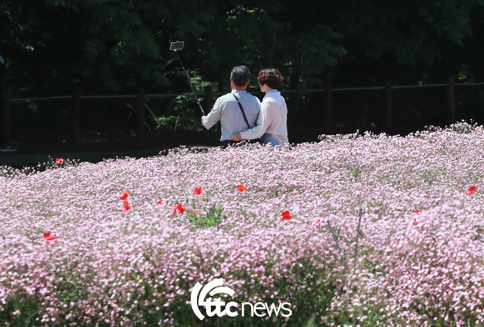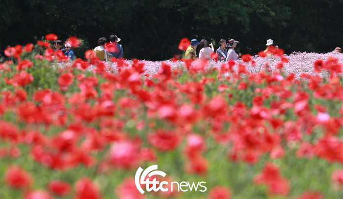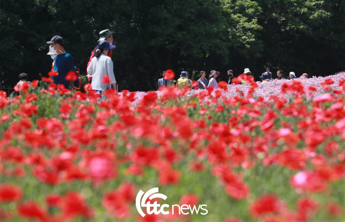 | ▲ 15일 경남 함양군 함양읍 상림공원을 찾은 관광객들이 활짝 핀 양귀비 꽃밭을 거닐고 있다(사진=함양군 김용만 주무관 제공). |