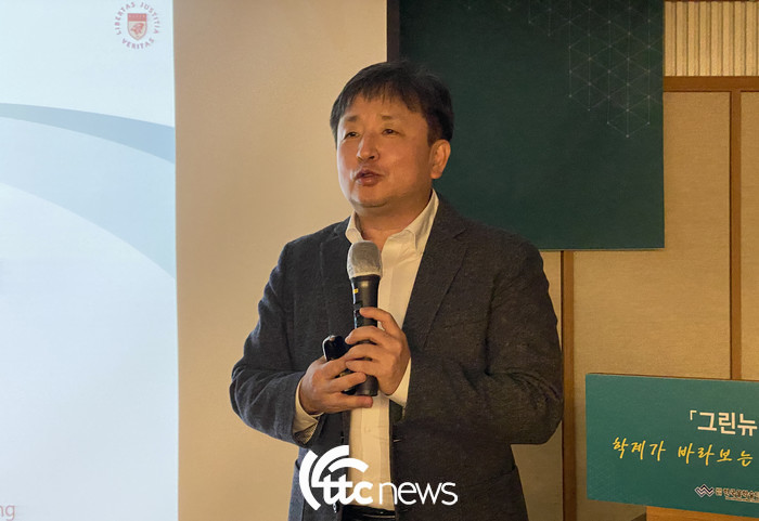 | ▲ 16일 오후 서울 중구 한국프레스센터에서 한국물학술단체연합회가 주최한 ‘학계가 바라보는 그린뉴딜의 정책 방향’ 포럼에서 홍승관 고려대 교수가 ‘디지털 워터혁명’은 미래 뉴딜 혁명과 일맥상통한다고 말하고 있다. |