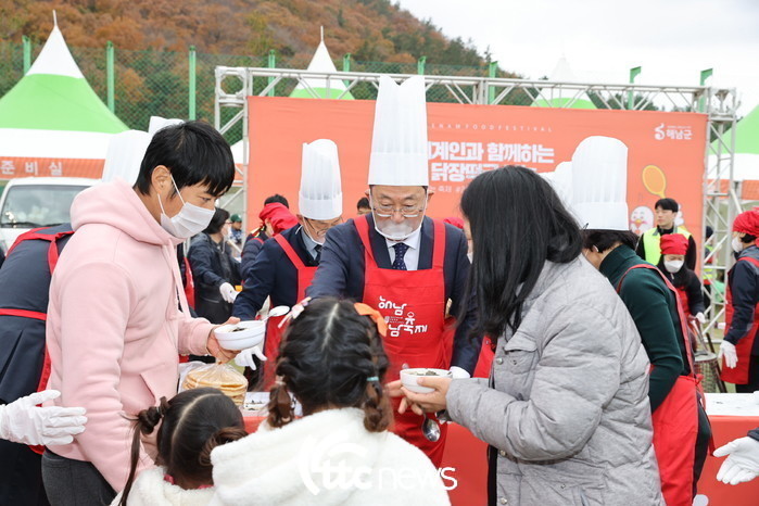 | ▲ 지난 11일부터‘오감만족 미식여행’을 주제로 두륜산 도립공원 일원에서 진행된 제4회 해남미남축제가 13일 성황리에 마무리 되었다. 사진은 명현관 해남 군수(사진 가운데)가 해남의 쌀과 김, 닭으로 만든 2022인분 닭장떡국 나눔 행사에 참여해 닭장떡국을 나누고 있다.(사진=해남군 제공) |