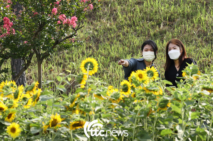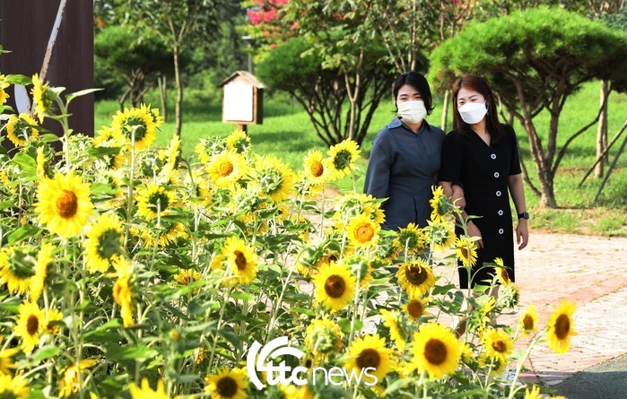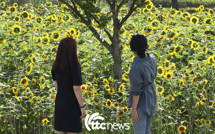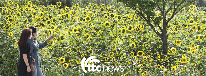 | ▲ 입추(立秋)를 이틀 앞둔 5일 전남 강진군 강진 호수공원 광장에 활짝 핀 해바라기를 시민들이 즐기고 있다.(사진=강진군 제공) |