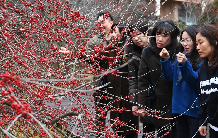 | ▲ 경기도 용인의 한 초등학교 교사들이 겨울방학을 맞아 천리포수목원을 찾았다. 새빨간 낙상홍 열매를 관심있게 살펴보고 있다. |
