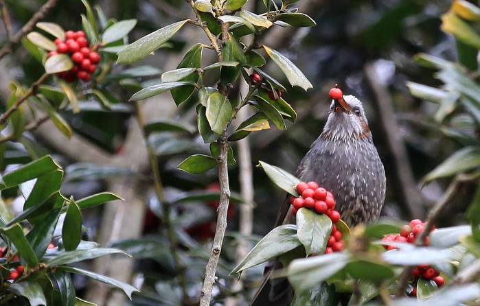 | ▲ 직박구리가 호랑가시나무 열매를 입에 물고 있다. 천리포수목원은 겨울새들의 소중한 먹이터이다. |