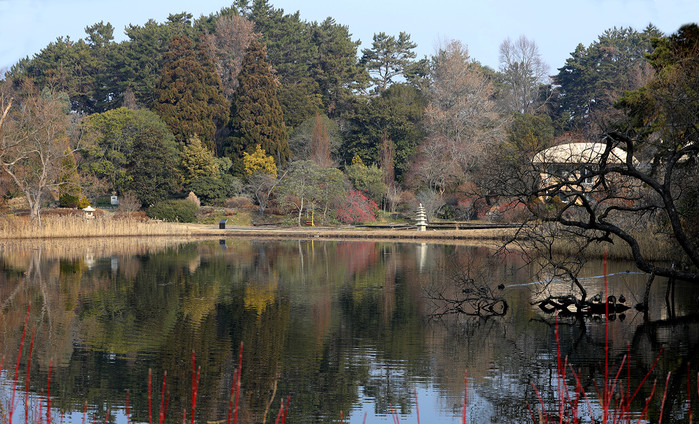 | ▲ 다양한 식물이 어우러진 천리포수목원 겨울이지만 다채로운 색으로 채워진 천리포수목원이 연못에 반영되어 아름답다. 천리포수목원의 겨울정원은 꽃과 잎으로 가려온 나무 그대로의 모습을 볼 수 있어 봄부터 가을까지 알아채지 못했던 나무들의 수려하고 관능적인 몸매, 다양한 열매와 표피를 감상하기 좋은 시기이다. 특히 이곳 수목원에 호랑가시나무를 비롯 각종 수목에 달려있는 풍성한 열매들은 오색딱다구리를 비롯해 곤줄박이, 직박구리, 물까치, 박새 등 새들의 소중한 겨울 먹이터이다. |