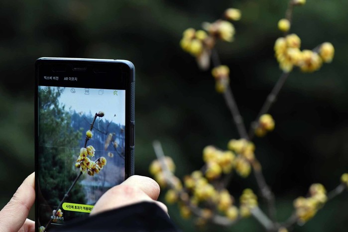 | ▲ 수목원을 찾은 한 관람객이 봄의 전령사로 알려진 납매 꽃을 자신의 스마트폰에 담고 있다. |