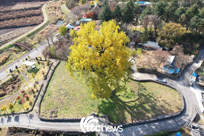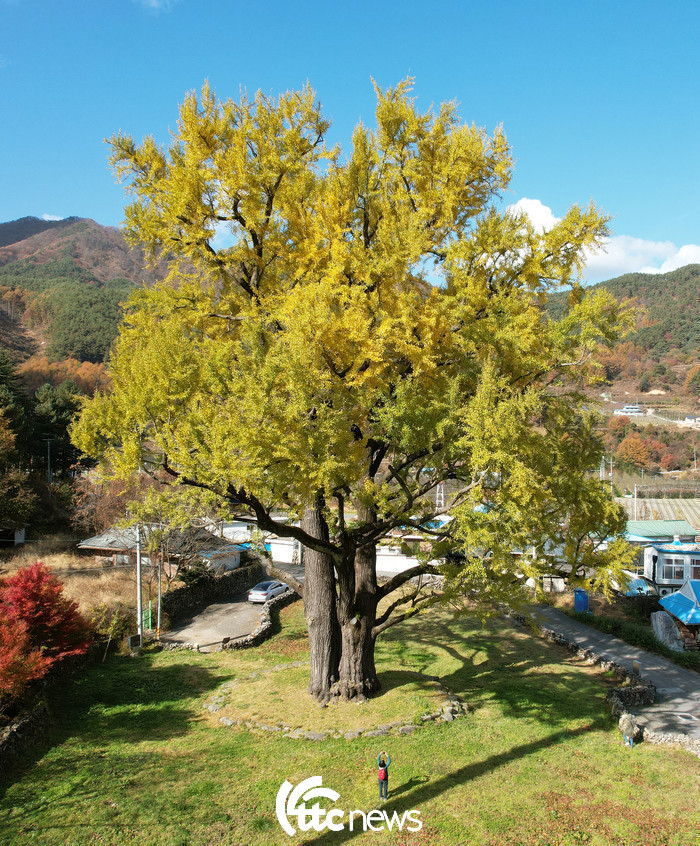 | ▲ 7일 경남 함양군 서하면 운곡리 은행마을에서 노랗게 물든 천연기념물 제406호 은행나무(사진=함양군 김용만 주무관 제공) |