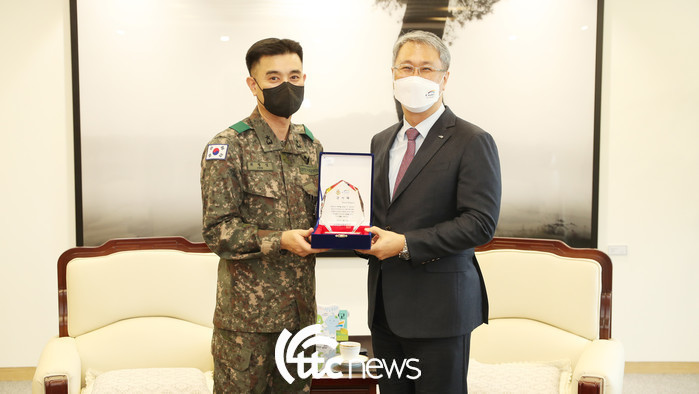 | ▲ 23일 대전시 대덕구 한국수자원공사 본사에서 국군의무사령부 최병섭 사령관(사진 왼쪽)이 한국수자원공사 박재현 사장(사진 오른쪽)에게 감사패를 전달하고 있다.(사진=한국수자원공사 제공) |