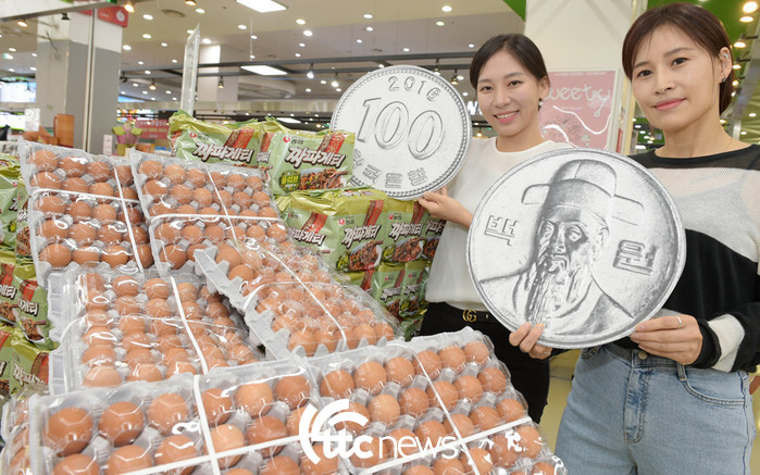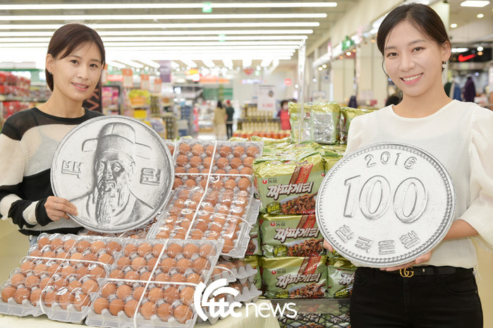 | ▲ 농협유통이 16일 서울 서초구 청계산로 농협 하나로마트 양재점에서 일정금액 이상 결제 시 달걀(특란) 30구 한 판, 짜파게티(멀티)를 100원에 구매할 수 있는 ‘100원의 행복’ 초특가 행사를 소개하고 있다. |