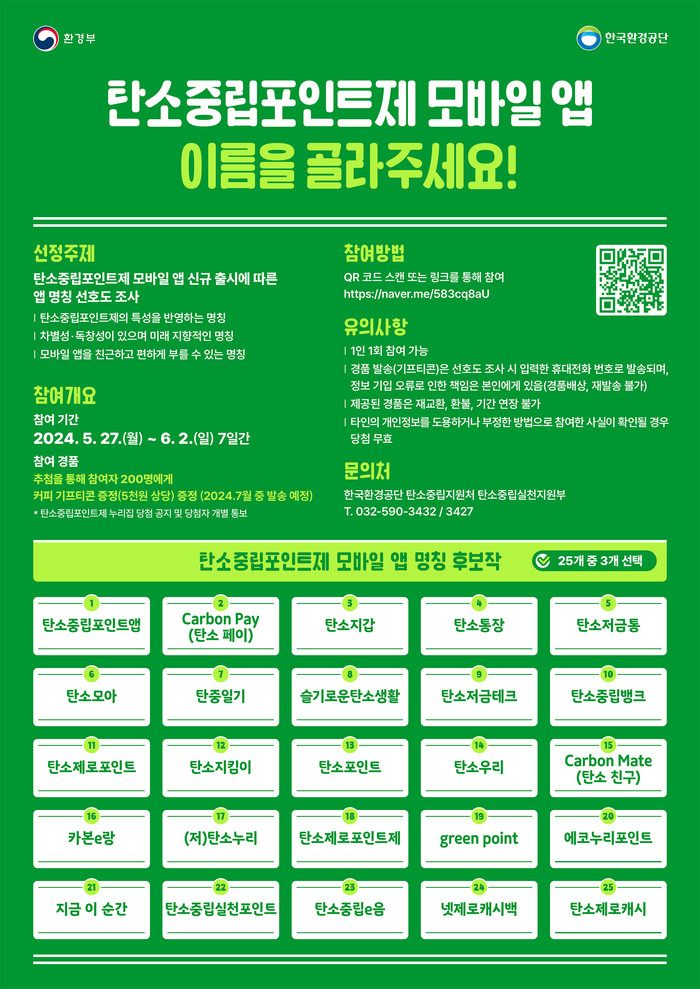 한국환경공단(이사장 안병옥)은 6월2일까지 탄소중립포인트제 가입자들의 접근성과 편의성 향상을 위해 개발 중인 ‘탄소중립포인트제 모바일 앱’ 명칭에 대한 선호도 조사를 실시한다.