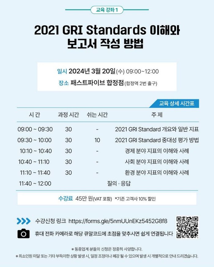 글로벌 상위 250개 기업 중 78%가 사용하고, 아시아태평양 지역에서 ESG 공시하는 기업의 81%가 사용하고 있는 ESG공시기준은 GRI (Global Reporting Initiative) 기준이다. 당일 오전에 진행되는 “2021 GRI Standards 이해와 보고서 작성 방법” 교육 강좌는 공시항목과 각 공시항목들을 어떻게 보고할 수 있는지에 대한 방법과 사례들에 대해 교육한다.