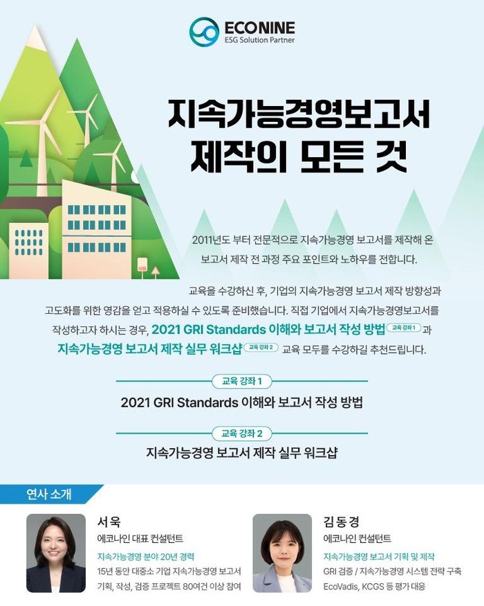 ESG(환경·사회·지배구조)경영 자문 컨설팅 기업 에코나인이 오는 20일 기업 대상 “지속가능경영보고서 제작의 모든 것” 교육 시리즈를 오프라인으로 실시한다. 이번 교육 시리즈는 “2021 GRI Standards 이해와 보고서 작성 방법”과 “지속가능경영보고서 제작 실무 워크샵” 교육강좌로 구성되어 있다.