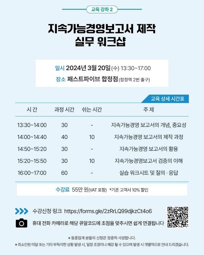 오후에 진행되는 “지속가능경영보고서 제작 실무 워크샵” 교육 강좌는 2011년부터 지속가능경영보고서를 제작해 온 ESG컨설팅 사로서의 경험과 노하우를 배울 수 있다. 실제 컨설팅 담당자가 진행하는 보고서 제작 과정과 방식에 대해 배우고 같이 실습도 해볼 수 있다는 점이 특징이다.