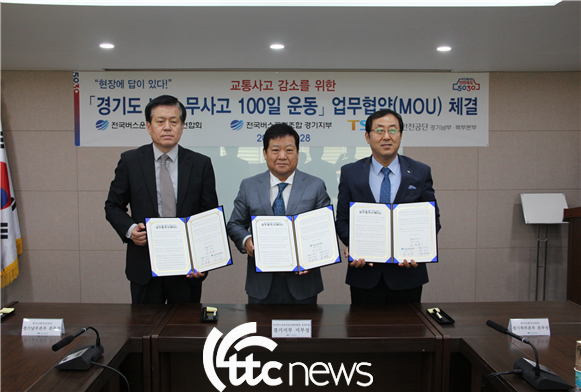 전국버스공제조합 경기지부는 4월 28일 방배동 소재 전국버스공제조합 본부 사옥에서 한국교통안전공단 경기 남부, 북부본부와 버스회사 교통사고 감소를 위한 “경기도 버스무사고 100일 운동” 업무협약을 체결했다.