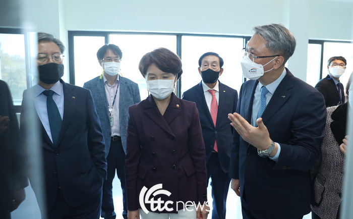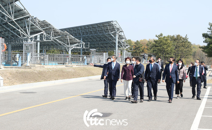 한정애 환경부 장관은 19일 경기도 안산시 소재 한국수자원공사 시흥정수장에서 건물의 에너지 자립률 제고를 위해 환경부가 주관하고 한국수자원공사에서 주최하는 업무협약에 참석하고, 시흥정수장의 탄소중립 현장을 점검했다.