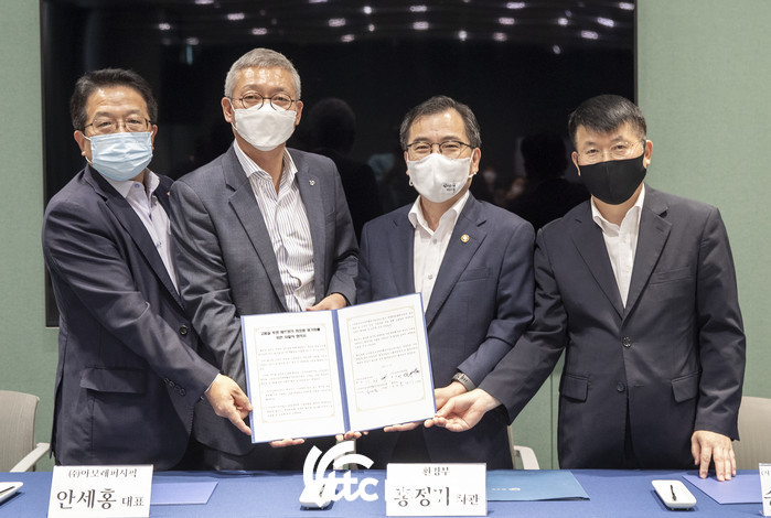 | ▲ 홍정기 환경부 차관이 23일 서울 용산구 아모레퍼시픽 본사에서 열린 '고품질 투명 페트병의 화장품 용기화를 위한 협약식'에 참석해 협약서 서명 후 참석자들과 함께 기념촬영을 하고 있다. (사진=환경부 제공) |