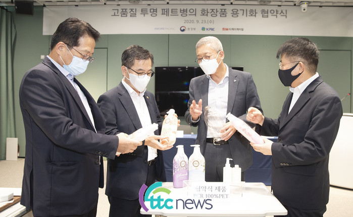 | ▲ 홍정기 환경부 차관(왼쪽 두 번째)이 23일 서울 용산구 아모레퍼시픽 본사에서 열린 '고품질 투명 페트병의 화장품 용기화를 위한 협약식'에서 국내 페트병 재생원료를 사용해 만든 화장품 용기를 살펴보고 있다 |