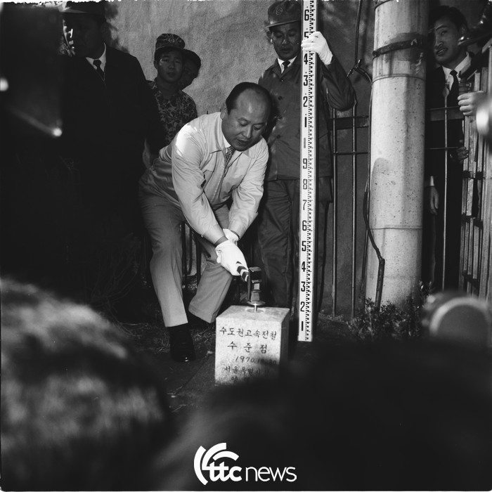 | ▲ 보신각 울타리 안에 설치된 직경 7cm, 길이 12cm의 놋쇠 못이 한가운데에 박힌 사방 25cm의 화강암 수준점에는 ‘수도권 고속전철 수준점. 1970.10.30.’이라는 글씨가 음각으로 새겨져 있다. 1970년 10월 30일 양택식 시장이 이 수준점을 설치하고 있다.(사진=서울시 제공) |