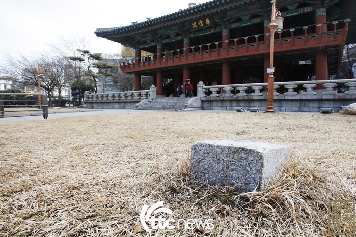 | ▲ 보신각 앞 잔디 마당에 묻혀 있는 사방 25cm의 지하철 수준점은 수도권 전철의 높이 및 깊이의 척도가 되는 원점이었다. 종로의 이 수준점을 기준으로 지하철 선로의 깊이와 터널의 높이, 역사(驛舍)의 상하축 높이가 가늠되었다. |