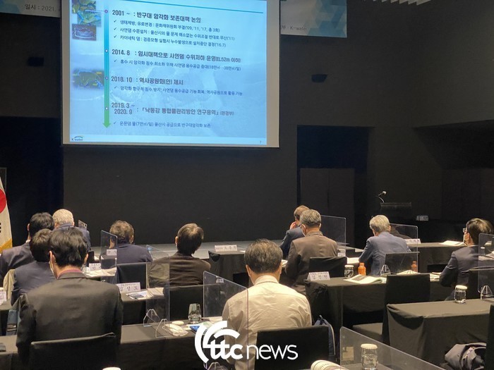 한국수자원공사(K-water) 수자원시설처 김진원 부장은 발제를 통해 “사연댐 수문 설치는 반구대 암각화 등 문화재 침수를 방지하는 최적화 방안”이라며 “암각화 침수 최소화를 위한 임시대책으로 사연댐 운영 수위를 EL.52이하로 운영한 결과 침수가 발생하지 않았다”고 밝혔다.