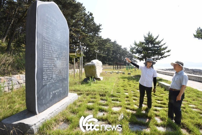 | ▲ 고대도 선교센터장 박상석 목사(왼쪽)이 취재진에게 칼 귀츨라프 선교기념비 앞에서 귀츨라프 선교사의 고대도 상륙과 활동상에 대하여 설명하고 있다. |
