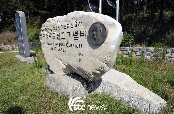또 기념비 왼쪽에는 “그가 우리를 깨웠고 이젠 우리가 그를 깨운다”는 비석을 세웠다. 비문에는 칼 귀츨라프의 선교사 및 문화 중개자로서의 업적을 ▲최초로 한국에 온 개신교 선교사 ▲최초로 한글 주기도문 번역 시도 ▲최초로 한문성경과 한문 전도서적의 전달 ▲최초로 한글의 우수성을 세계에 체계적으로 소개 ▲최초로 서양 감자 파종 ▲최초로 서양 선교사로서 서양 근대의술을 베풂 ▲동북아시아를 위한 최초의 체계적 선교전략 구상 등의 글귀가 새겨져 있다.