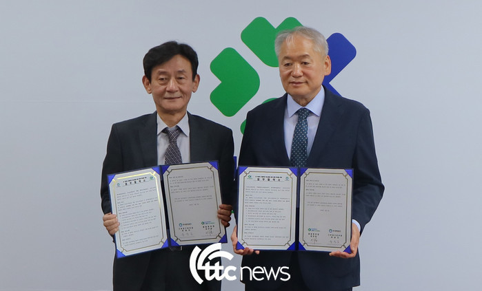 | ▲ 한국환경공단은 7일 2050 탄소중립사회로의 성공적인 전환을 위한 도로교통공단 TBN교통방송과 업무협약을 체결했다. 협약을 체결한 한국환경공단 유승도 기후대기본부장(오른쪽)과 도로교통공단 TBN한국교통방송 이우호 방송본부장이 기념촬영을 하고 있다. (사진=한국환경공단 제공) |