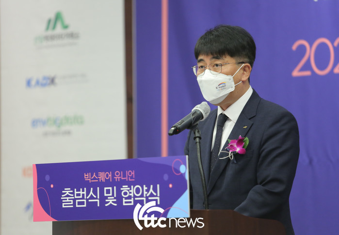 | ▲ 3일 대전 ICC호텔에서 개최된 ‘환경·산림·교통·유통소비·농식품’ 등 5개 분야 대한민국 대표 빅데이터 플랫폼 공동 협의체인 ‘빅스퀘어 유니언’ 출범식에 참석한한국수자원공사 이준근 그린인프라부문 이사가 인사말을 전하고 있다(사진=한국수자원공사 제공) |