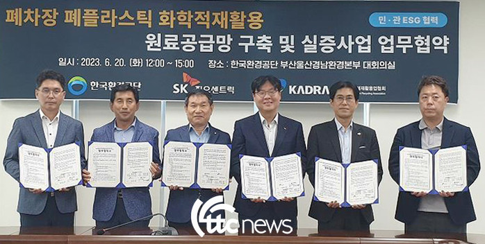 한국환경공단(이사장 안병옥)은 20일 공단 부산 울산경남환경본부(본부장 김동운)에서 SK지오센트릭, 한국자동차해체재활용업협회 부산울산경남지부와 ‘폐차장 폐플라스틱 화학적 재활용 원료공급망 구축 및 실증사업’업무협약을 체결했다.