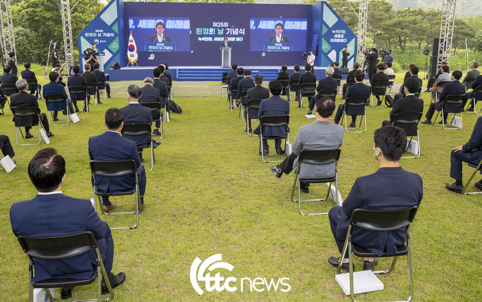 | ▲ 4일 인천 서구 국립생물자원관 잔디광장에서 열린 '제25회 환경의 날' 기념식에서 조명래 환경부 장관은 기념사를 통해 “미래를 열기 위해서는 바로 지금부터 녹색전환을 시작해야 한다”고 강조했다. (사진=환경부 제공) |
