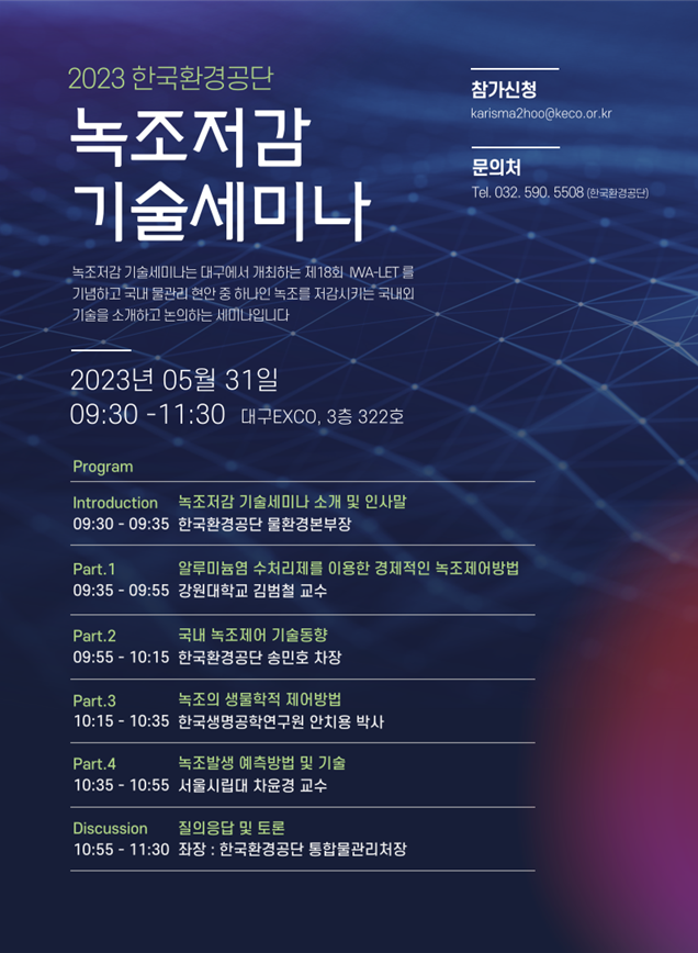 5월 31일 대구EXCO 322호에서는 열리는 녹조저감 기술세미나는 국내 물관리 현안 중 하나인 녹조문제를 효과적으로 대응하기 위한 방안을 모색한다. 이번 세미나에서는 알루미늄 수처리제를 이용한 경제적인 녹조제어방법(김범철 강원대 교수), 국내 녹조제어 기술동향(송민호 한국환경공단 차장), 녹조의 생물학적 제어방법(안치용 한국생명공학연구원 박사), 녹조발생 예측방법 및 기술(차윤경 서울시립대 교수)이 발표된다. 이를 통해 녹조 발생의 사전예방 및 사후대응 방안을 모색하고 건강한 물환경을 조성할 방향을 논의한다.