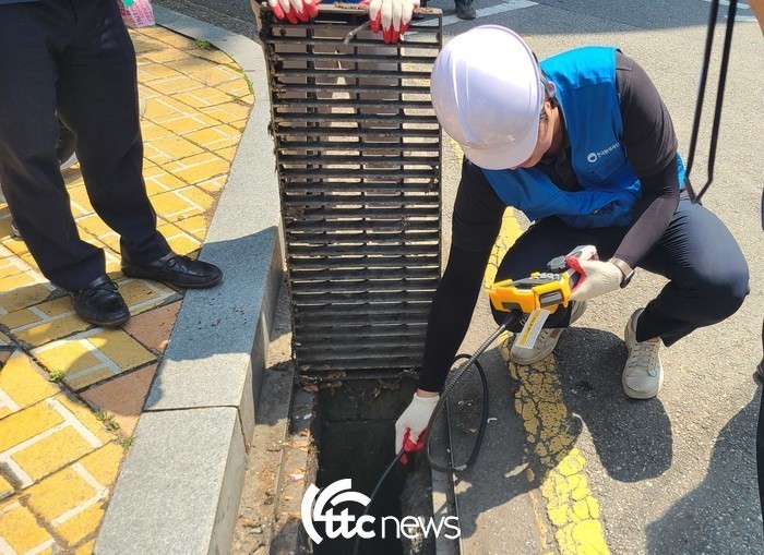 | ▲ 11일 경기도 광명시 하안동 일원 ‘막힘없는 빗물받이 만들기‘ 일일 캠페인 현장에서 한국환경공단 직원이 하수관로 내시경 촬영을 통해 빗물받이 막힘 여부를 확인하고 있다.(사진=한국환경공단 제공) |