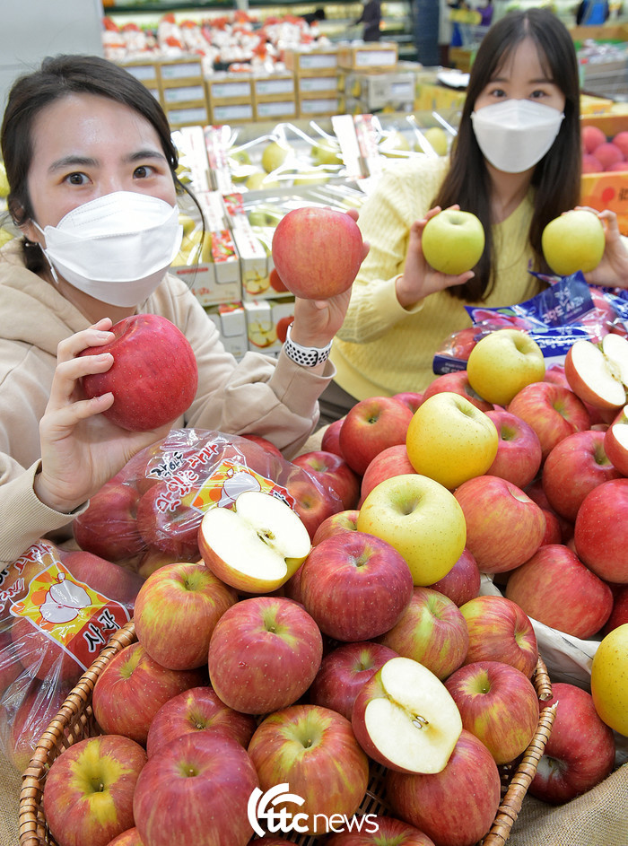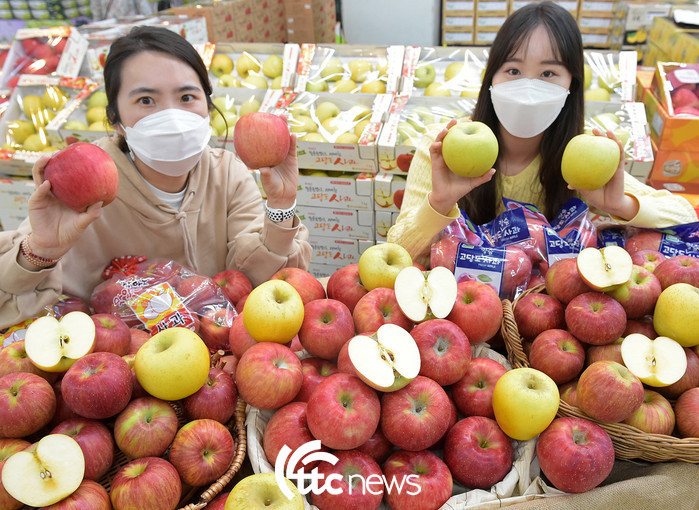 ▲ 13일 서울 서초구 소재 농협 하나로마트 양재점에서 직원모델들이 다양한 ‘사과’를 선보이고 있다.(사진=농협유통 제공)