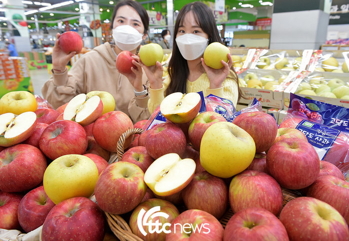 ▲ 서울시 서초구 소재 농협 하나로마트 양재점에서는 ‘양광’ 8,900원(5과/봉지), ‘시나노 스위트’ 7,780원(2kg/봉지), ‘알프스 오토메’ 5,980원(1kg/팩) 등 다양한 품종의 사과를 판매한다.(사진=농협유통 제공)