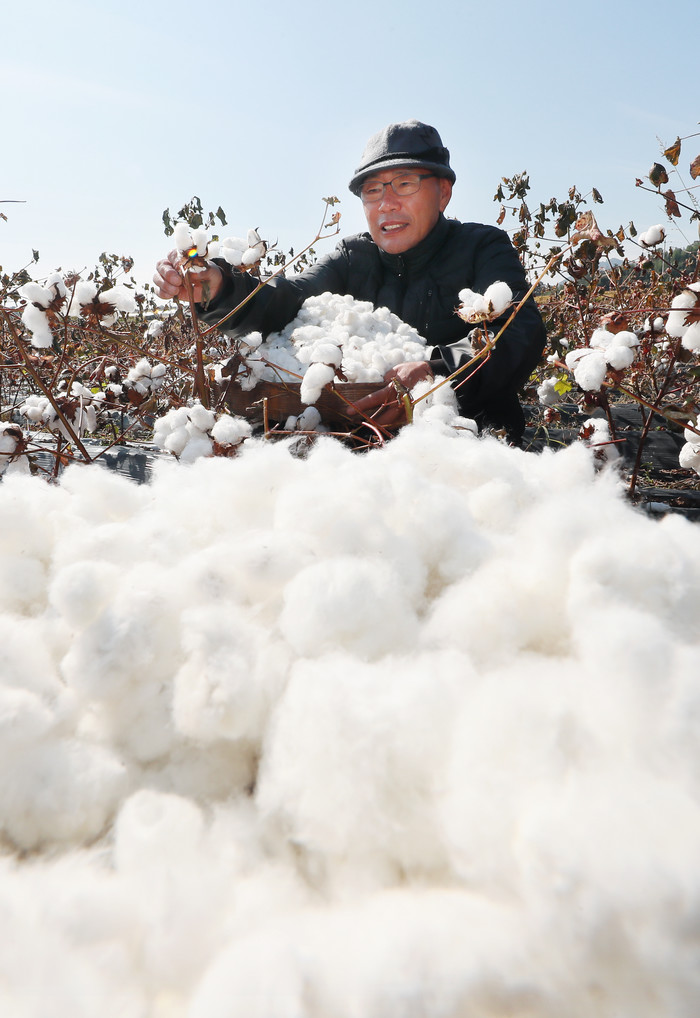 20일 경남 함양군 지곡면 개평한옥마을 목화밭에서 임채장 씨가 목화솜을 수확하고 있다. 수확한 목화는 종자와 섬유를 분리한 뒤 천연 면직물과 이불솜 등을 만드는데 활용된다.