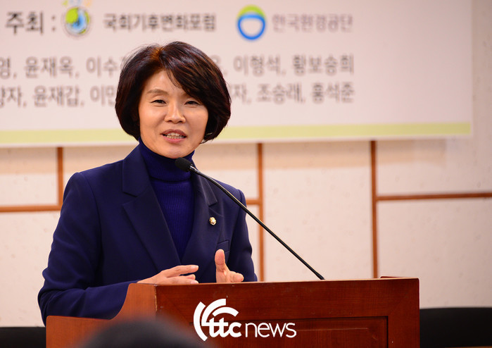 | ▲ 국회 기후변화포럼 공동 대표의원을 맡고 있는 한정애 더불어민주당 의원이 개회사를 통해 "폐배터리 자원 순환을 통해 국가 경쟁력을 키우자"고 말하고 있다. |