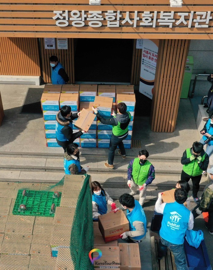 | ▲ 한국해비타트는 6일 경기도 시흥시 정왕동에 거주하는 주거취약계층 200세대에 살균소독제와 위생용품, 비상식료품으로 구성된 긴급지원키트 200개를 지원했다. 이날 지원에는 해비타트 홍보대사인 배우 권오중씨와 시흥시 남수영 정왕종합사회복지관장과 직원, 한국해비타트 자원 봉사자 등 10여 명이 참여했다. 권 대사(사진 맨 앞)를 비롯 봉사자들이 긴급지원키트를 들고 주거취약계층이 살고 있는 임대주택을 향하고 있다. |
