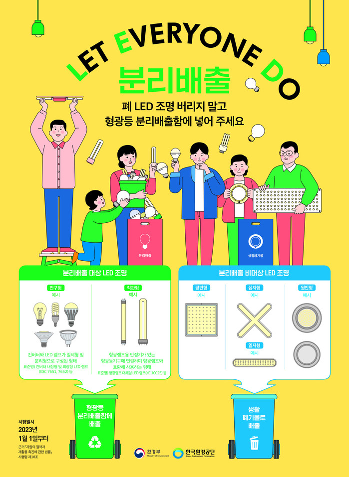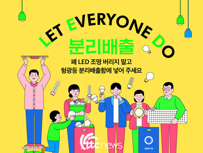 한국환경공단은 폐발광 다이오드(LED) 조명의 회수·재활용률을 높이기 위해 분리배출 캠페인(Let Everyone Do)을 추진한다고 밝혔다.