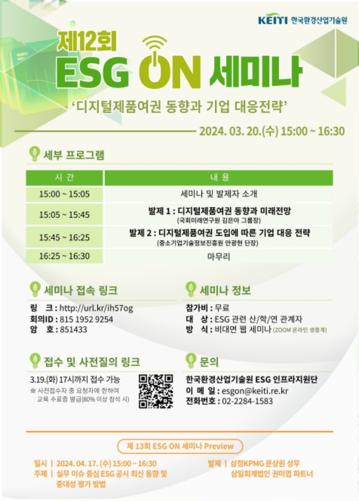 한국환경산업기술원(원장 최흥진)은 오는 20일 오후 ‘제12회 이에스지(ESG) 온(ON) 세미나’를 온라인상에서 열고 디지털 제품 여권 제도의 도입 동향과 기업의 대응 전략을 주제로 의견을 나눈다.