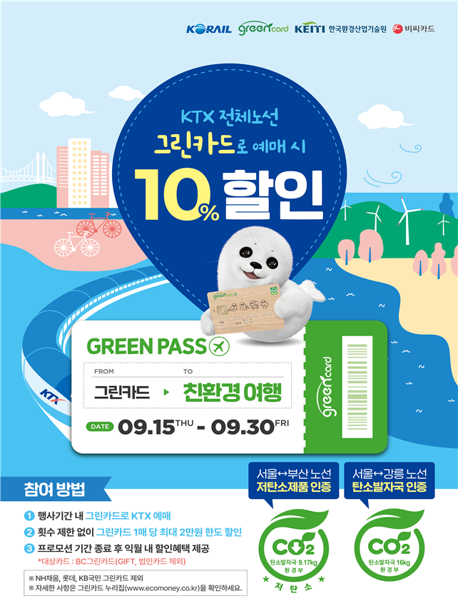 한국환경산업기술원은 BC카드, 한국철도공사와 함께 가을철 여행을 떠날 때 개인차량 이동을 최소화하고 저탄소 이동수단 이용을 장려하기 위해 KTX 할인 혜택을 제공하는 그린카드 특별행사를 진행한다.