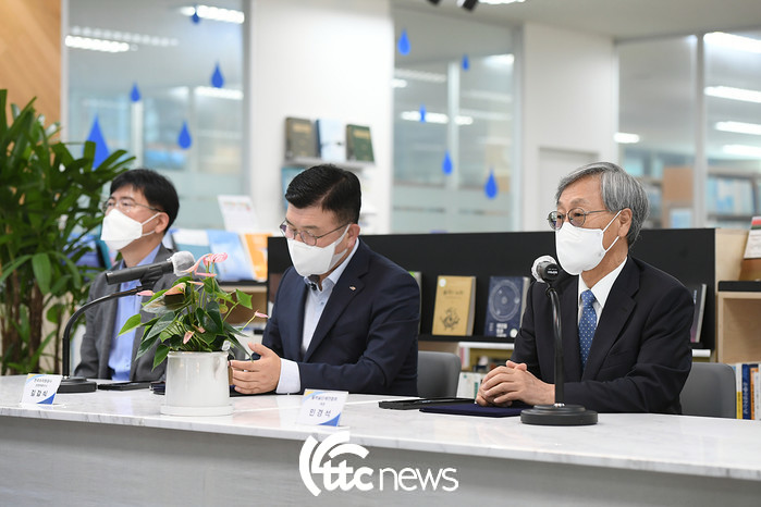 | ▲ 한국수자원공사와 한국물학술단체연합회가 9일 대전시 대덕구 수자원공사 본사에서 ‘물 전문자료의 공유가치 창출과 공공 활용을 위한 업무협약’을 체결했다. 협약식에서 민경석(오른쪽) 한국물학술단체연합회 회장이 "물관련 자료 기증을 통한 지식공유"의 중요성에 대해 발언하고 있다. |