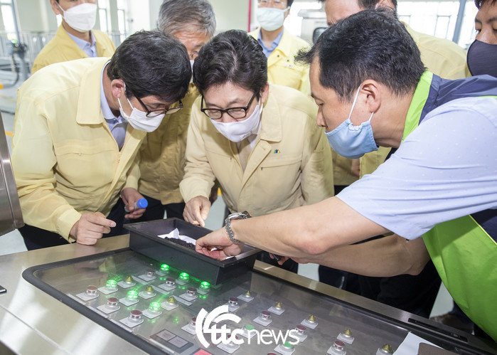 조명래 장관은 인천 공촌정수장에서 고도정수처리시설과 활성탄 여과지 등을 점검하고 이어 천마산 배수지에선 배수지 청소 상황과 거름망 설치 상태 등을 살펴봤다.