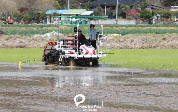 20일 오전 경남 함양군 지곡면 도촌리에서 강기원씨가 이양기로 논에 모를 심고 있다. 경남 함양군 지역에서는 5월 중순경 일반벼 이앙하는 것과 비교하면 약 25일 정도 빠른 모내기이다. 이날 모내기한 벼는 추석용 햅쌀로 출하하게 된다.