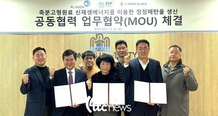 지난 26일 중부대학교 고양캠퍼스에서 축분고형원료를 이용한 청정메탄올 생산을 위해 ㈜플라젠(대표 경국현), ㈜ENF에너지(대표 남순덕)와 재단법인 포항테크노파크(원장 배영호)가 공동연구에 서명하고 국내 최대 규모의 청정메탄올 생산 기지를 구축하기로 합의했다.