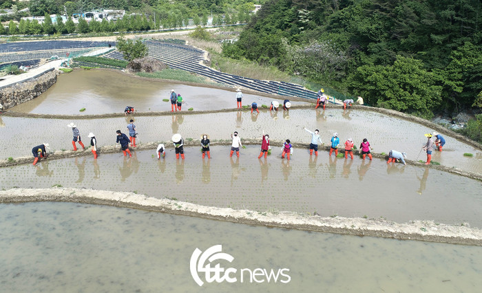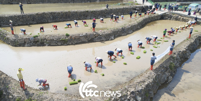 | ▲ 12일 지리산 자락인 경남 함양군 마천면 도마마을에서 다랑이논 국가주요농업유산 등재를 위한 전통 모내기가 시연되고 있다.(사진=함양군 김용만 주무관 제공) |