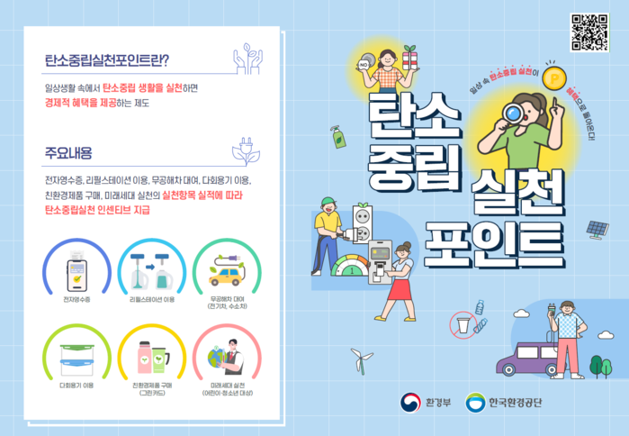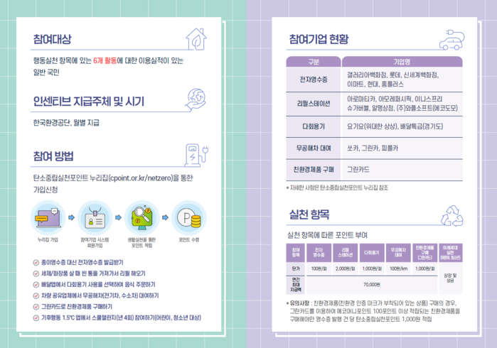한국환경공단은 탄소중립 실천포인트제 운영과 관련하여 참여자의 접근성과 편의성 향상을 위해 전자영수증 분야, 다회용기 사용, 무공해차 대여 기업 등으로 탄소중립실천포인트제 지급대상 참여 기업을 확대한다.